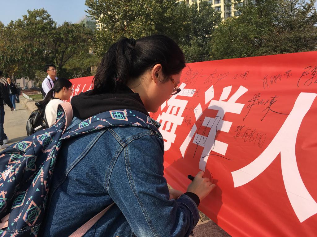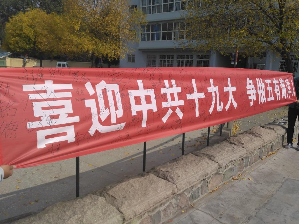 10月21日,我院学生会在小五四北举办横幅签字活动,旨在通过签字活动加强学生争做最美海洋人思想意识。活动伊始,同学们纷纷在“喜迎中共十九大,争做五有海洋人“的横幅前驻足、关注并签下自己的名字。签名活动仅持续了一个小时,但横幅上已经签满了同学们的名字,大家用实际行动响应号召,以实际行动表明认真学习十九大的精神。