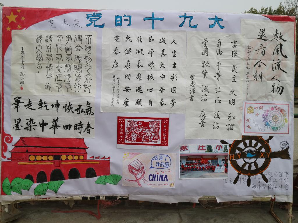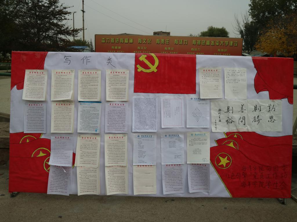 我院党员工作站结合工作实际,将十九大报告全文形成精炼的学习资料,组织全院学生进行学习。学生党员充分发挥带头作用,带领全院学生将自己的所学所感以丰富多样的形式展示出来,参与度高达90%。学习成果展示活动共收到作品271件,其中写作类作品195篇,原创诗歌19篇,板报类作品36幅,书法10幅,绘画11幅。作品形式丰富多彩,内容思想真实深刻,一幅“数风流人物,还看今朝”的书法作品苍劲有力,展示了海洋学子蓬勃向上,激流勇进的时代精神;一幅“不忘初心,牢记使命”的剪纸艺术栩栩如生,凝结了学生党员不负重托,一往无前的坚定信念;一首“你好,新时代”的原创诗歌气势恢宏,表达了新时代青年心系祖国,心有大我的家国情怀;“山海情”支教服务团队的摄影作品,新颖独到,展现了志愿者们无私奉献,勇于担当的服务精神;“心向十九大”、“共筑中国梦”等手绘板报线条柔和、色彩饱满,抒发了莘莘学子对祖国的大好河山、大美风景的无限热爱。经评委组评选,共选出李慧敏、陈怡乐、闫煦等同学的五十余幅优秀作品进行展出。展出伊始,同学们纷纷在展板前驻足、观看、热议,学习气氛浓厚,大家用实际行动响应党的号召,积极学习并践行十九大精神。