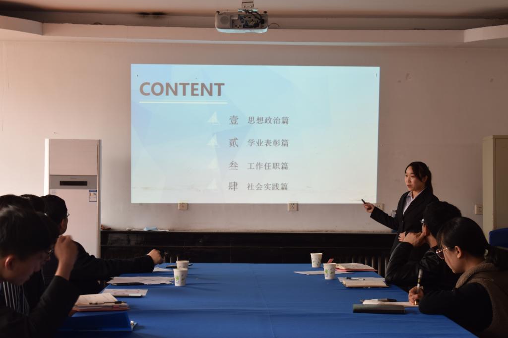 为全面提高当代大学生综合素质,展现青年学生奋发向上的精神风貌,发挥优秀学生榜样引领作用,我院于3月1日下午2:00在精细化工楼205会议室进行答辩。我院党总支副书记兼副院长卢中彬、分团委书记兼学工办主任辛雪琼、2017级辅导员兼学生会秘书长杜宗杰、2018级辅导员季朝阳出席本次答辩会并担任评委。
