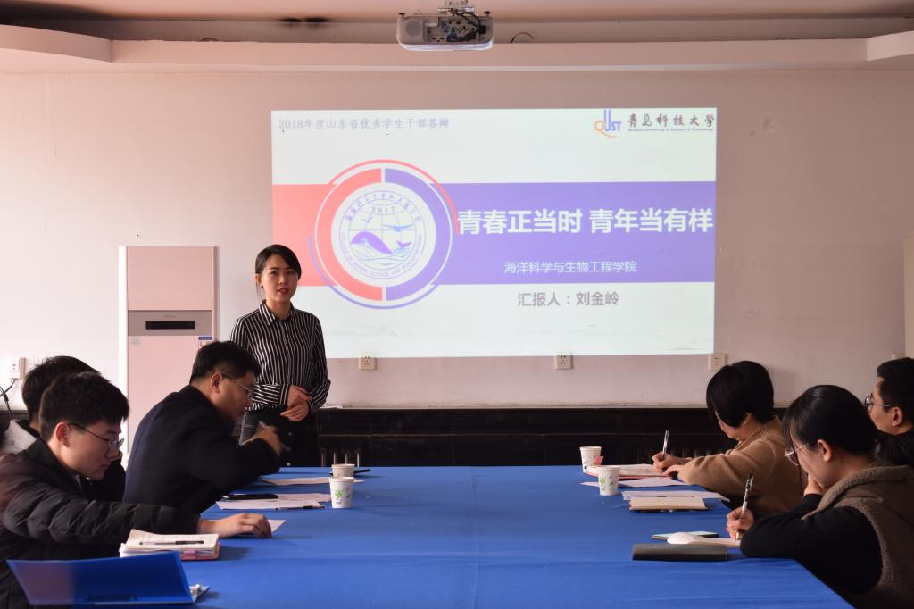 而后,高小宁,焉春雨,刘以媛,王慧,王征,刘金岭等学生依次进行答辩。他们分别从思想政治、学业表彰、工作任职、社会实践四个方向进行论述。通过这些同学的阐述,大家了解到当代优秀大学生应思想端正,党性扎实;努力学习,参与竞赛;认真工作,恪尽职守;乐于助人,志愿服务。最后由生物工程161班的蔡昊鸿同学进行先进班集体答辩。“有理想、有追求、有品质、有活力、有作为”是他们集体的真实写照。