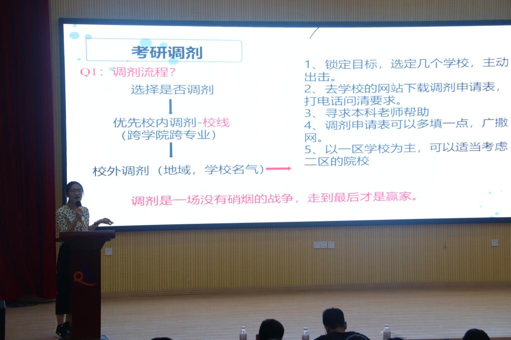 接下来,2015级优秀毕业生食品151王健、海科151程艺琳等同学为大家分享了自己的考研经验。从考研准备、考研调剂、恋爱与考研的关系等方面详细介绍。学长学姐们建议,英语要注重单词积累;专业课复习要全面,做过的题要加以强化。考研调剂要趁早,及时了解各院校信息。恋爱与考研可以并存,要学会合理处理关系,调节情绪波动。