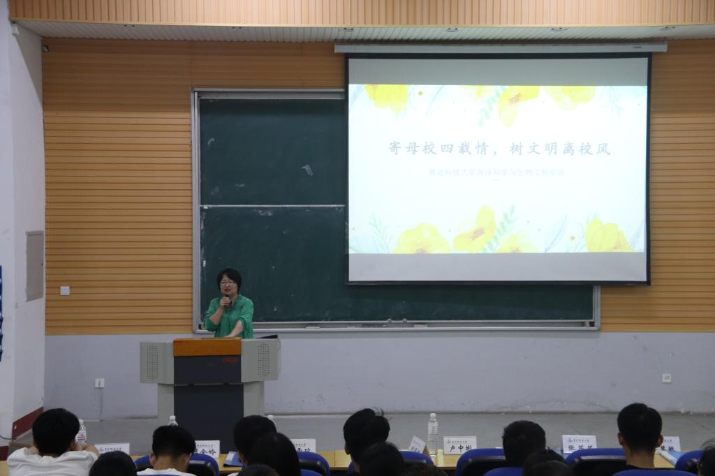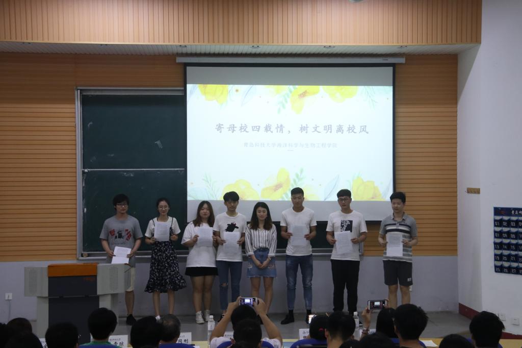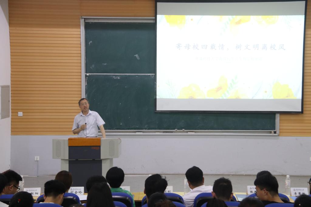 为树立文明离校之风,深化安全离校意识,促进师生之间的交流,营造温馨和谐的氛围,6月18日下午2:00,我院在二教101举办“寄母校四载情,树文明离校风”主题活动。此次活动邀请了我院党总支部书记刘同刚、党总支部副书记兼副院长卢中彬、2015级班主任代表以及2015级、2016级、2018级辅导员老师出席,我院全体2015级毕业生参与。