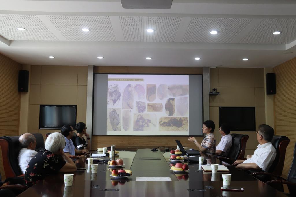 接下来,王硕教授作《琥珀研究汇报》。王硕教授介绍了琥珀的研究历史,展示了许多琥珀中早期被子植物和虫瘿的图片。从她的讲解中,与会人员了解到可以根据珀中的生物形态判断其所属类群,根据一些带有虫洞的植物标本推断出协同演化与取食关系。还可以根据琥珀的形成年代,探索重要类群起源,寻找早期演化证据。