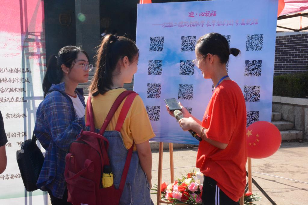 在新生报道处,我院精心准备了“迎•心祝福”特色活动,新生们扫描二维码后能够收到学长学姐们的专属祝福语。每一条祝福,都表达了海院师生对2019级新生到来的热烈欢迎,希望19级海洋学子能在大学四年中活出自己的色彩,迎接美好的未来。同时,迎新现场开启了“梦启青科,逐梦海洋”现场直播,通过QQ平台,我院将热情快乐的迎新氛围感染了观看直播的每个人。此外,去年的萌娃“海海”和“洋洋”在今年迎新之际收获了自己的新伙伴,他们与好伙伴一起为新生送来了美好祝愿。