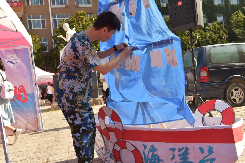 迎新场地设有“海洋号”帆船,吸引了新生及家长的注目,在新生报道处,每位新同学可以领取精美的明信片,写出自己对未来大学四年的规划或目标,悬挂至海洋号上,明信片将由学生会代为保存,在2019级同学毕业典礼结束时返还。此活动旨在帮助新生初步规划大学生活,相信新生会不忘初心,带着家长们的期盼,向着既定目标扬帆起航。