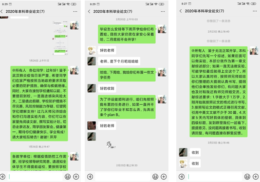 本学期还承担本科毕业论文工作,为不影响本科学生论文质量,保证学生顺利通过毕业答辩。除了按照学校、学院要求及时登录“毕设论文管理系统”完成毕业论文的各项工作外,还逐一与毕业生单独联系沟通,建立了毕业设计群,利用网络手段对学生选题、查阅文献、毕业论文等工作进行全面的指导。在不能进校做实验的情况下,经常和学生进行交流,发信息安抚他们的情绪,并在开学时给学生布置了文献综述的撰写工作。编辑具体任务和要求发给他们,指导他们先撰写提纲,并和研究生一起商量撰写内容是否合适,进行修订,然后再按照提纲撰写正文内容。目前三位同学都已经撰写了几千字的文献综述内容。