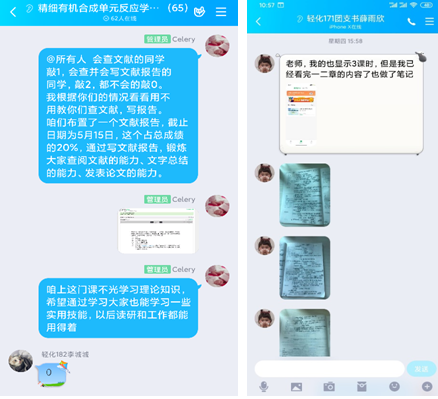 本学期有《精细有机合成单元反应》和《生物质能源》两门专业课程的教学任务,因为疫情不能正常开学,在开学前一周参加了学校组织的培训—— “超星”“爱课程”等多个教学平台的使用,根据自己课程的需要,为了尽可能达到比较好的教学效果,我选择了“爱课程-中国大学MOOC”平台,并引入了课程上和本课程教学内容和目标比较相近的两门课程《精细有机合成化学和工艺学》和《生物质材料与能源导论》。开学前对两门课分别建立了QQ群,将两门课在平台上建立了SPOC课程,在QQ群里里指导学生注册并选课。采用QQ群和课程平台相结合的方式给学生进行线上教学,提前两周将教学内容发布到平台上,对每周的学习内容和重点,提前在在QQ群和MOOC平台上发布公告。在学习的过程中指导同学们一边听课一边做笔记,不明白的内容下课后QQ群中再集中进行讨论。学生学习状态非常积极,很多同学把他们记录笔记还有手写的作业发给我点评,平台上显示已经上过的几次课都是全勤,并且观看次数和观看时间都是满格。再课堂之余,还教授同学们如何进行文献查阅和撰写文献报告,全面提高他们的各项技能。