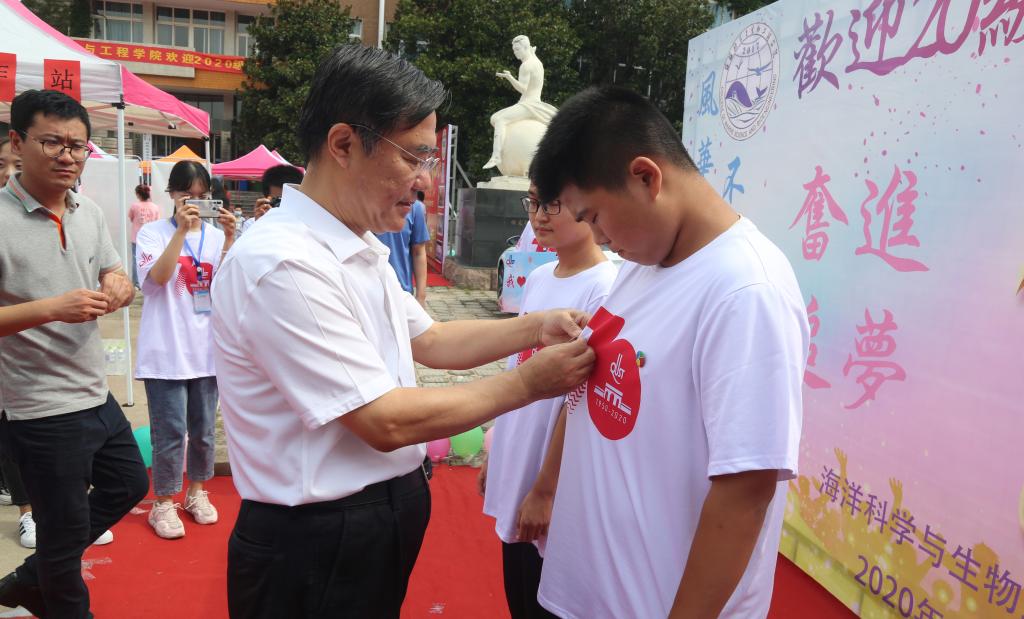 在迎新现场,校党委书记马连湘为两位名字中含有“海洋”的2020级新生代表肖海洋和陈海洋亲自佩戴校牌、我院院徽,并深情寄语全体海洋学子要牢记科大人使命,传承科大家风,在科大七十年校庆这一新起点,在我院学有所成,为科大、为青岛做出更大的贡献。