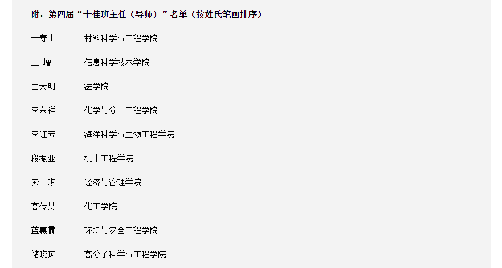 根据《青岛科技大学十佳班主任(导师)评选办法》(青科大学字﹝2014﹞30号),学校组织开展了第四届“十佳班主任(导师)”评选。经过学院推荐、学校审核、学生评议、大众投票和评审委员会投票等环节,我院李红芳老师获评青岛科技大学第四届“十佳班主任(导师)”称号。
