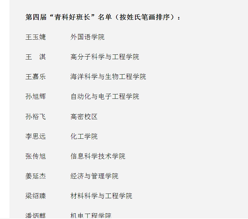 据悉,根据根据《关于评选青岛科技大学第四届“青科好班长”的通知》,经组织推荐、资格审核、宣传展示、公开评审等环节,评选出相应名单。