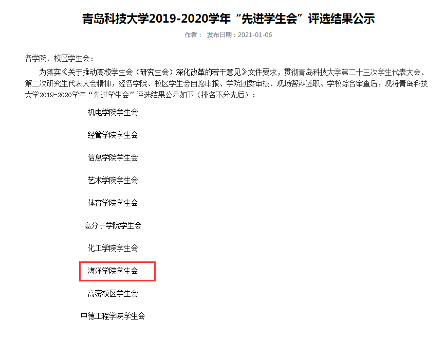 近日,学校对青岛科技大学2019-2020学年“先进学生会”评选结果公示,我院学生会荣获青岛科技大学2019-2020学年“先进学生会”荣誉称号。