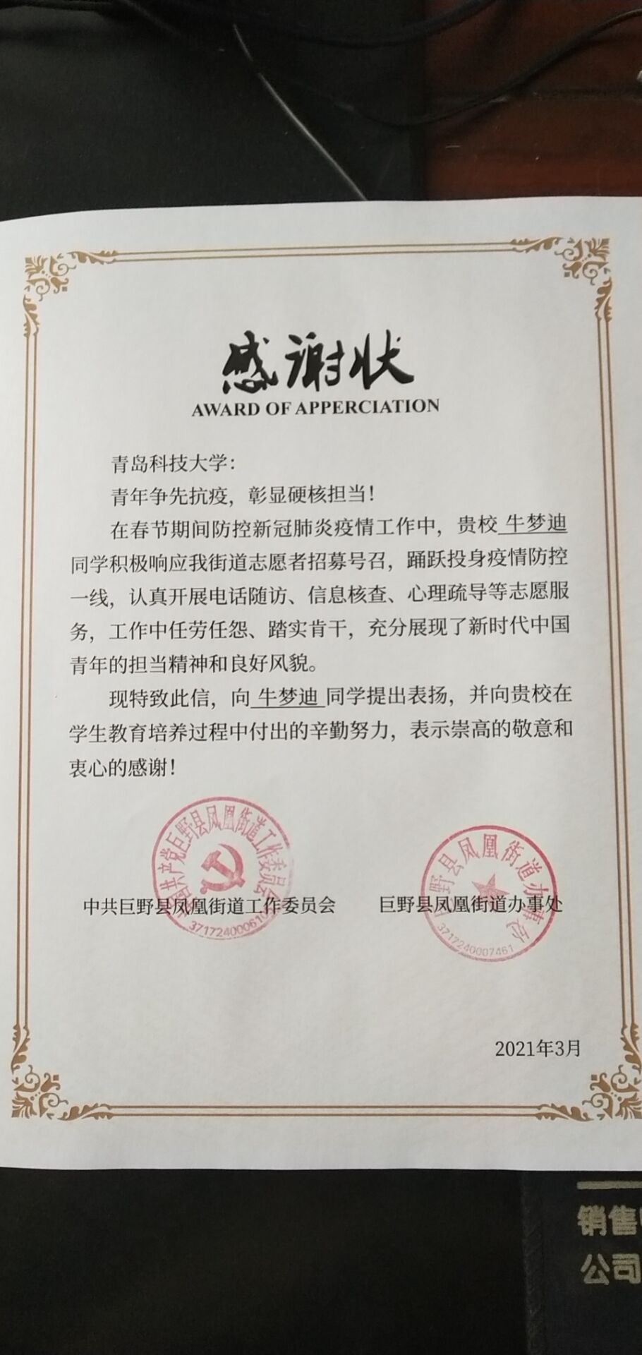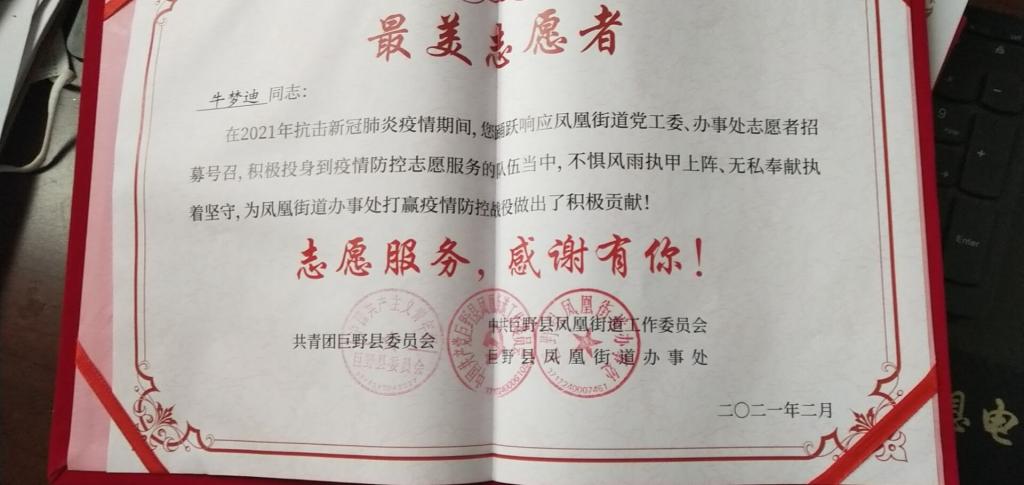 参加疫情防控感受:在过去的一个月中在疫情防控指挥部为凤凰街道办事处的疫情防控工作尽了自己的一份力量,负责确认、登记、排查出返乡人员人次,协助凤凰街道实现春节期间疫情零输入、零传染、零扩散。当前,疫情仍在全球蔓延,国内零星散发病例和局部暴发疫情的风险仍然存在,夺取抗疫斗争全面胜利还需要付出持续努力。青年志愿者作为疫情防控工作重要新生力量,需要树立战胜疫情的坚定信念,为战胜疫情积极作为。