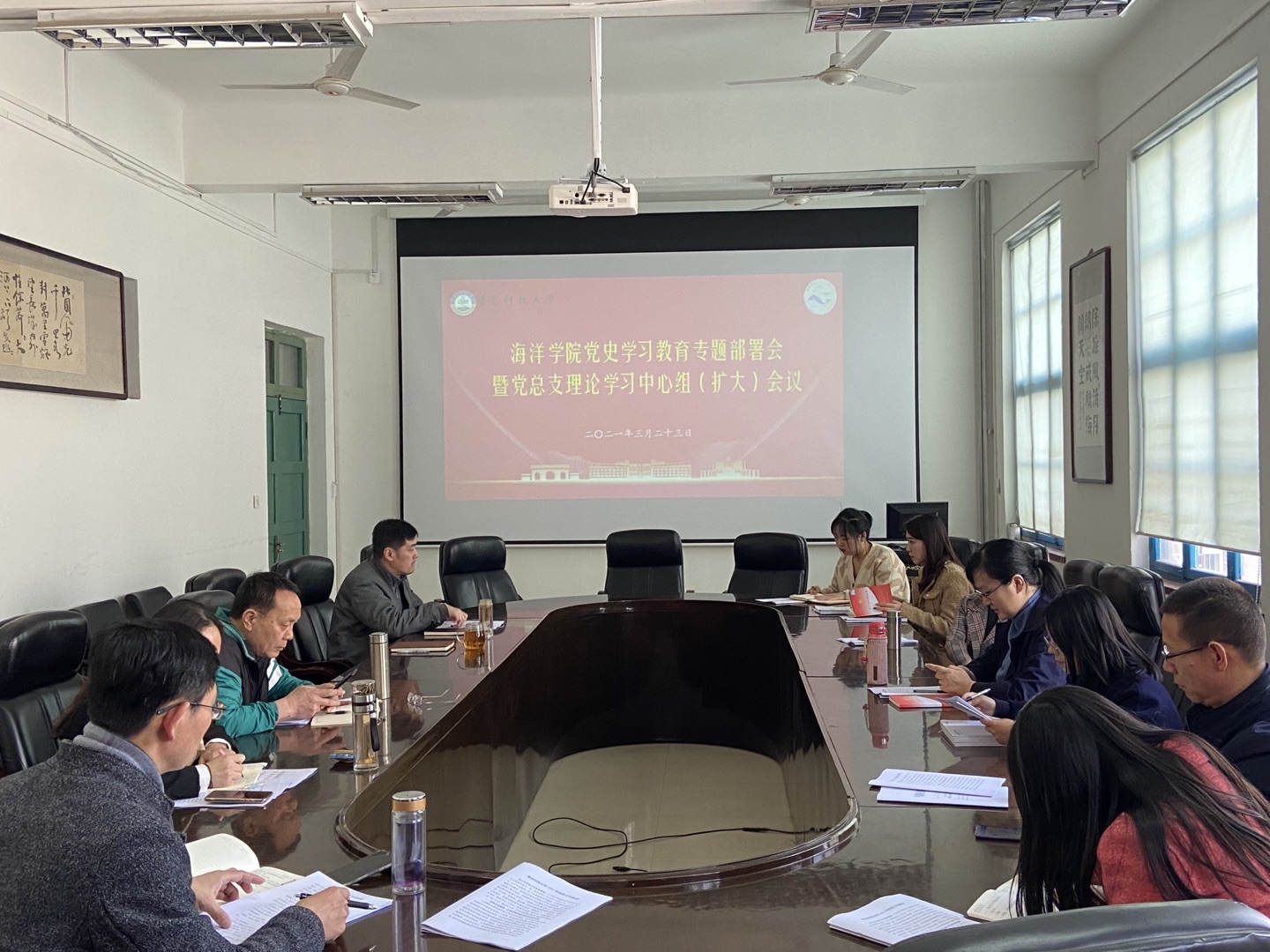 会上,周宪锋就扎实有效开展党史学习教育工作提出三点要求。一是提高政治站位,深刻认识党史学习教育的重大意义。开展党史学习教育是党中央站在“两个一百年”奋斗目标历史交汇关键节点上的重大决策部署,要理解好“为何学”、把握好“学什么”、谋划好“怎么学”,要认真学习上级文件要求和学校动员大会精神,高标准组织好学院党史学习教育。二是打造海院特色,确保党史学习教育取得实效。按照学校实施方案和任务安排,制定学院实施方案,紧扣“学党史、悟思想、办实事、开新局”的要求,突出“学史明理、学史增信、学史崇德、学史力行”的目标,保证规定动作做到位,自选动作有特色,努力做到“两确保一创新”,即确保学习时间、确保学习成效、创新学习形式。三是做好工作结合,以党史学习教育推动学院高质量发展。将党史学习教育与学校重点任务、攻坚突破相结合,与学院学科建设、专业认证相结合,与师德师风、学生培养相结合,避免出现“两张皮”情况,切实推动中心工作,以党史学习教育为高质量党建赋能,深化高质量党建引领高质量发展。