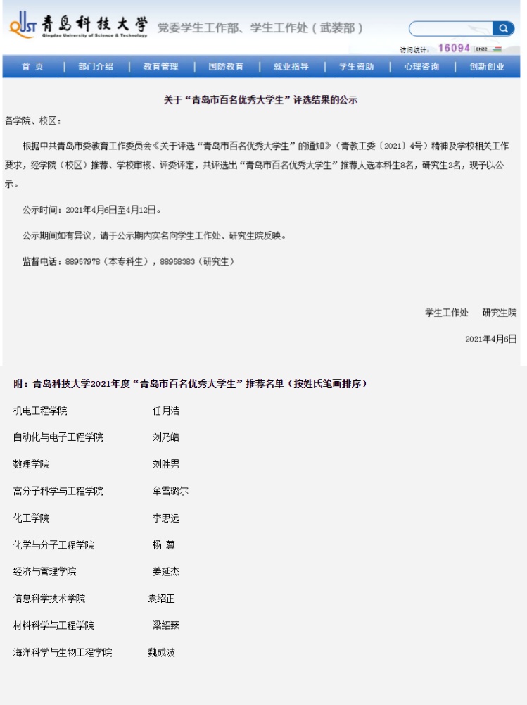根据中共青岛市委教育工作委员会《关于评选“青岛市百名优秀大学生”的通知》(青教工委〔2021〕4号)精神及学校相关工作要求,经学院(校区)推荐、学校审核、评委评定,共评选出“青岛市百名优秀大学生”推荐人选本科生8名,研究生2名,我院魏成波成功入选。