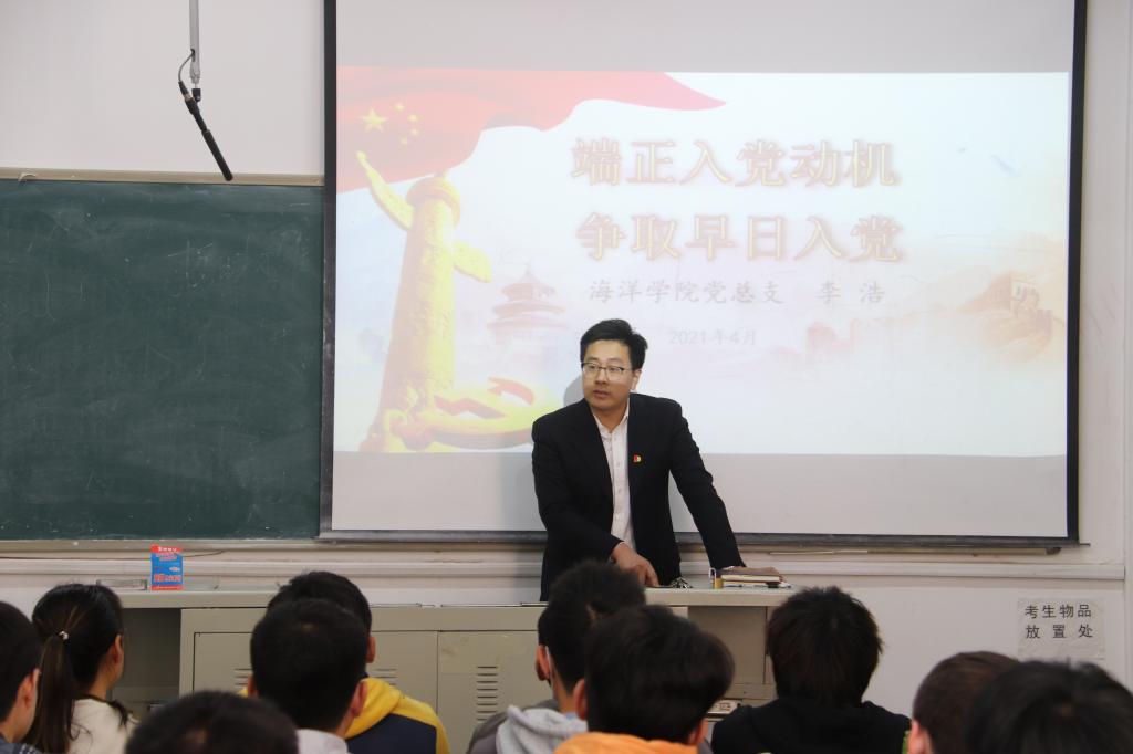 李浩以“端正入党动机,争取早日入党”为题展开主讲,并告诉全体成员摆正思想、端正动机,只有端正入党动机,才能产生正确的入党的行动,才能经受住党组织的考验,才能有持久不衰的动力,才能够在日常工作和生活的各个方面更加严格地要求自己,逐步培养和树立起无私奉献的奋斗精神。他教育在场的入党积极分子及发展对象,要杜绝功利型、虚荣型、盲从型入党,要坚定共产主义理想,全心全意为人民服务。他强调,入党积极分子和发展对象要从学院学风建设、宿舍文明建设、日常事务管理等方面发挥先锋模范作用,要求全体成员学习学习再学习、实践实践再实践、提高提高再提高。