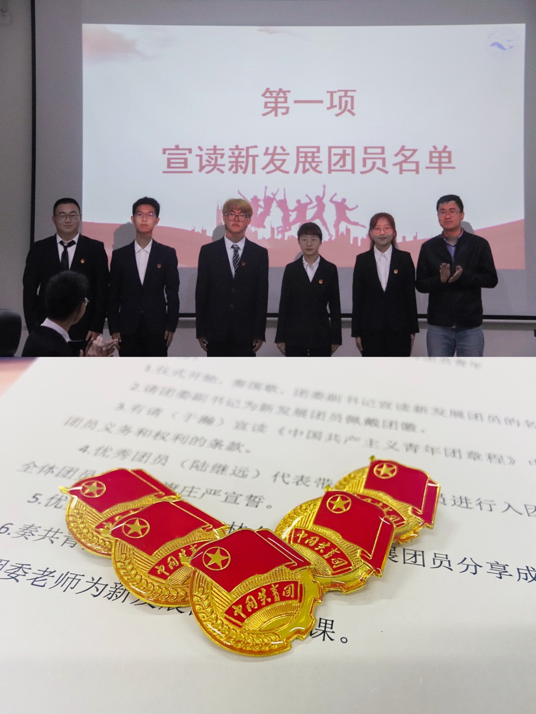 在庄严的国歌声中,会议正式开始,杜宗杰宣读2021年度新发展团员名单,并为5位同学佩戴团徽,他表示,沉甸甸的团徽意味着自己肩负的历史使命与责任担当,团员们应以身作则,履行团员义务,遵守团的章程,执行团的决议,努力践行社会主义核心价值观。