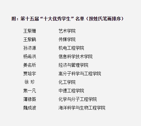 根据《青岛科技大学本专科学生荣誉奖奖励办法》(青科大字﹝2018﹞170号)和《关于评选青岛科技大学第十五届“十大优秀学生”的通知》(青科大学字〔2021〕9号)要求,结合学校实际,按照公开、公正、择优的原则,经学院(校区)推荐、资格审核、网络投票、现场汇报、民主投票等环节,共评选10名学生为青岛科技大学第十五届“十大优秀学生”,我院魏成波成功入选。