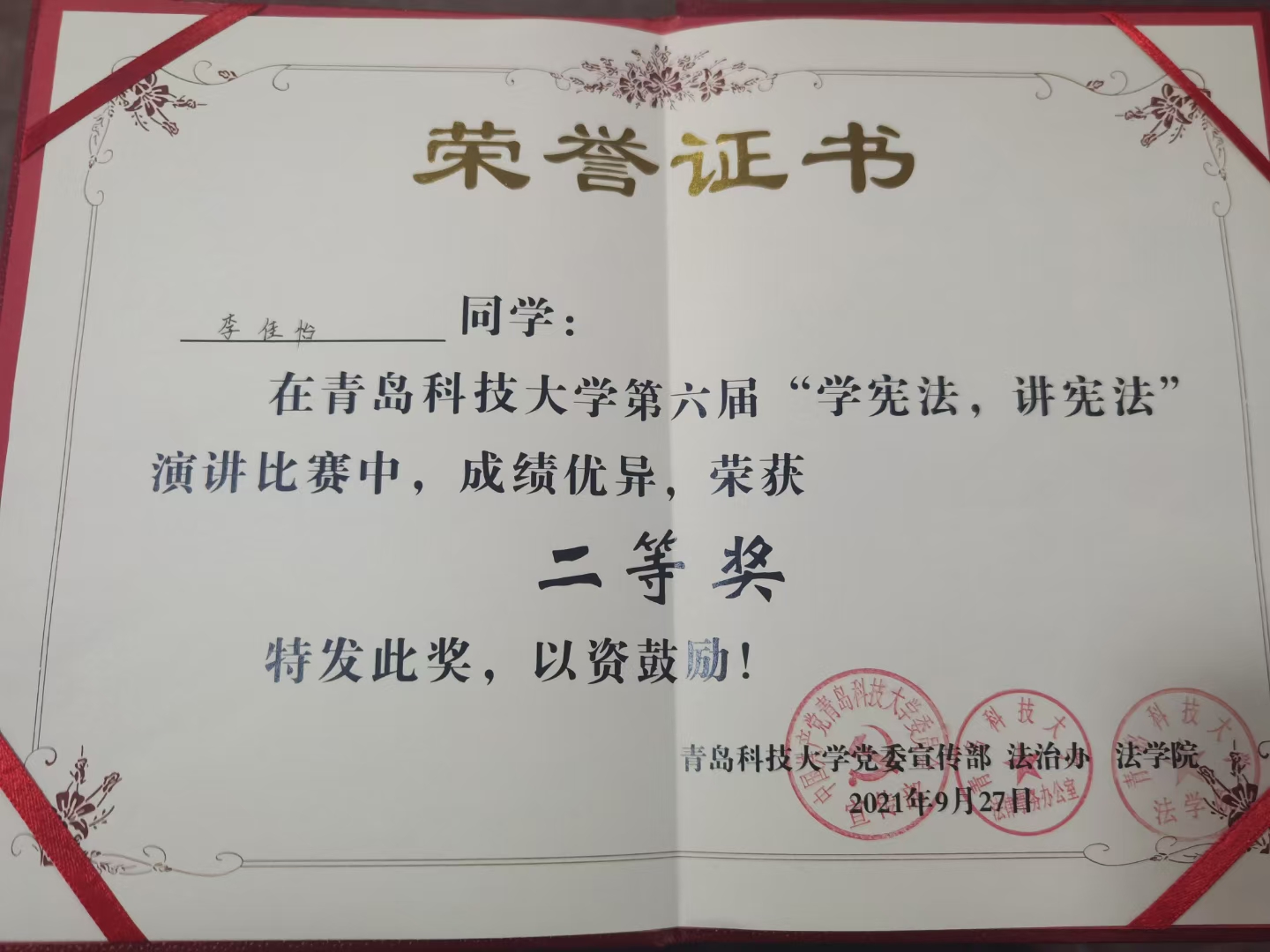 来自各学院选拔推荐的十七位参赛选手,围绕“宪法”主题,讲述宪法与国家、社会、个人之间的密切关系,结合时下热点话题、典型案例,积极传递法治力量和温度。演讲过程中,选手们情感饱满,语调铿锵,充分展现了当代大学生自信从容的青春风采。经过激烈角逐,我院的李佳怡荣获二等奖。