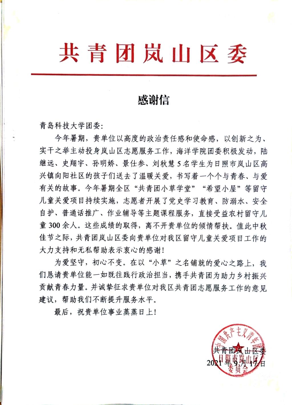 日照岚山区团委向我院团委发来感谢信,表达了对本次学院派出的暑期社会实践团队的感谢之情,对由陆继远、孙明娇、史翔宇、景仕参、刘秋慧5位同学组成的“心互联·新能源”志愿服务队在高兴镇向阳社区开展的“共青团小草学堂”“希望小屋”等工作表达肯定,赞扬了青科学子乐于奉献的优秀品德,感谢学院对志愿服务工作一直以来的鼓励与支持。