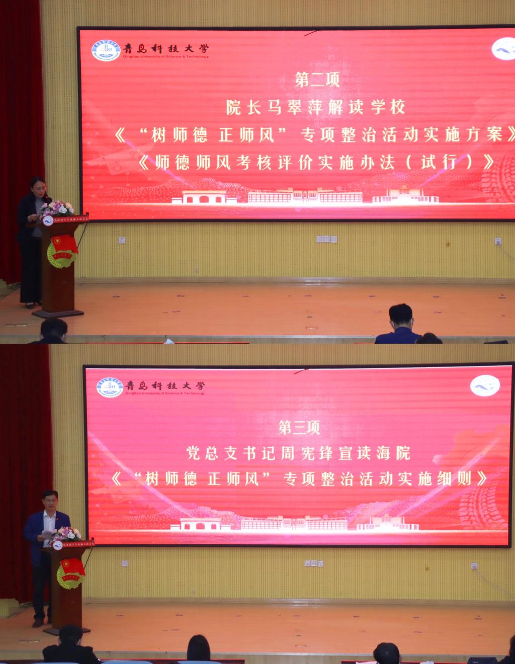 活动中,院长马翠萍解读了学校《“树师德、正师风”专项整治活动实施方案》和《师德师风考核评价实施办法(试行)》。学院党总支书记周宪锋宣读学院《“树师德、正师风”专项整治活动实施细则》,要求教职工充分认识深化师德师风建设专项整治活动重要性,严格落实好实施方案提出的工作任务,强化学习,提升素养,提高依法执教水平,牢记初心使命,建设高水平师资队伍。副院长李昉领学《新时代高校教师职业行为十项准则》,党总支副书记兼副院长臧传永领学《青岛科技大学师德师风负面清单》,院长助理王晓春领学教育部《研究生导师指导行为准则》。