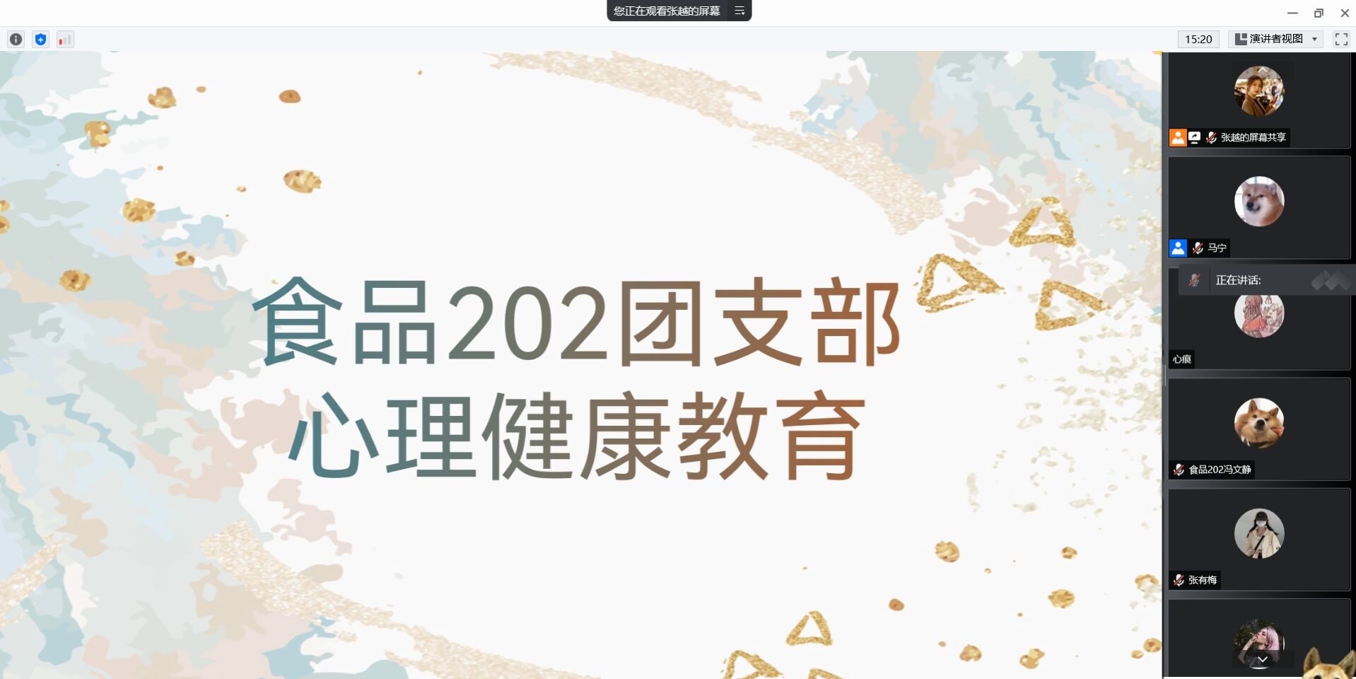 心理健康教育是大学生德育的基础,同时,社会转型期出现的一些问题,也成为影响大学生心理健康的重要因素。为了引导同学们树立正确的心理健康观念,丰富班内同学心理健康知识,形成良好的人际关系,积极引导大学生保持健康向上的心理状态,明确心理健康教育的重要性,食品202班召开心理健康教育线上会议,班级成员全部参加。