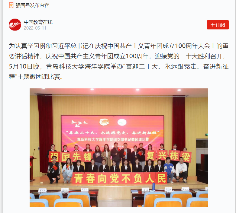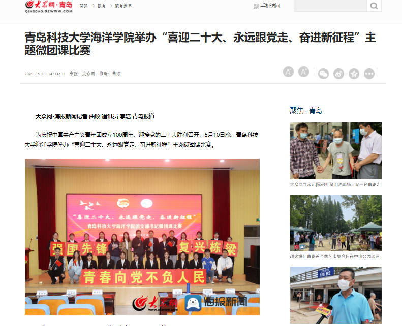 5月10日晚,青岛科技大学我院举办“喜迎二十大、永远跟党走、奋进新征程”主题微团课比赛。中国教育在线,青岛大众网、学习强国对主题微团课进行报道。