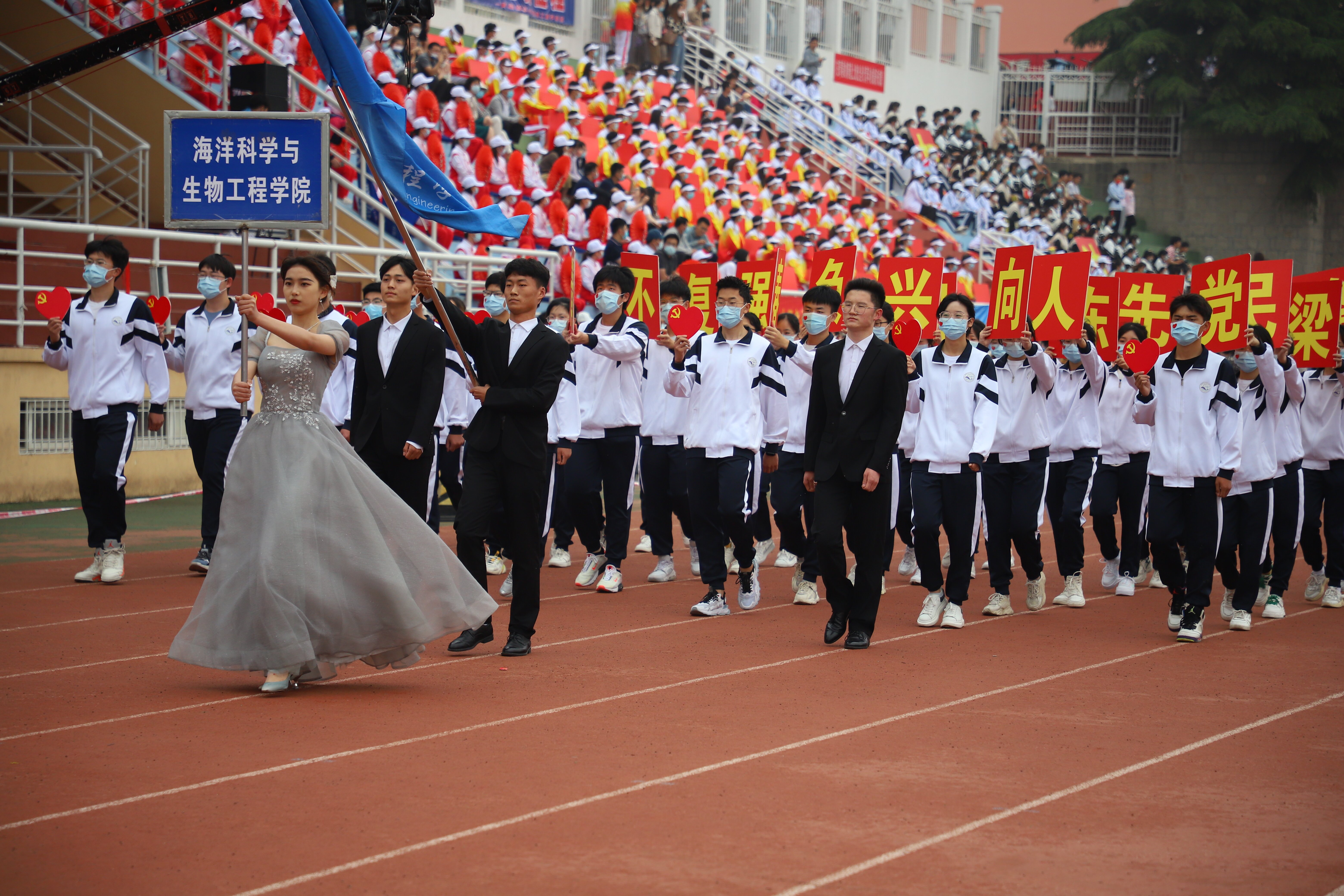 运动会开幕式在激昂的音乐声中拉开帷幕。我院方阵队员身着统一的服装、迈着整齐的步伐、喊着嘹亮的口号、带着昂扬的气势,他们精神饱满、朝气蓬勃,海洋学子以积极向上的精神风貌展现出争做强国先锋、复兴栋梁的高昂赞歌。
