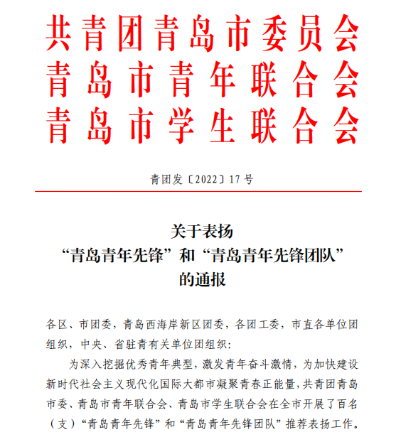 据悉,在中国共青团成立100周年之际,为深入挖掘优秀青年典型,凝聚青春正能量,共青团青岛市委、青岛市青年联合会、青岛市学生联合会开展了百名(支)“青岛青年先锋”和“青岛青年先锋团队”推荐表扬工作,在全市范围内涌现出一大批攻坚担当、爱岗敬业、矢志创新、奋进向上、崇德向善、无私奉献的优秀青年和青年集体,他们充分展现了新时代青年矢志创新、永攀高峰的良好形象。