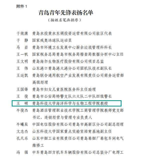 日前,共青团青岛市委、青岛市青年联合会、青岛市学生联合会联合通报表扬“青岛青年先锋团队”“青岛青年先锋”,我院马翠萍教授领衔的核酸快检研究团队获评“青岛青年先锋团队”,王硕教授获评“青岛青年先锋”。此次从青岛市各战线各领域评选出50支团队和50名个人,其中3所高校同时获评两项荣誉称号。