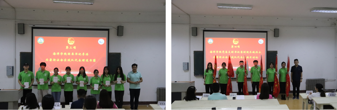 仪式上,李浩为社会实践重点队伍代表赠送《在庆祝中国共产主义青年团成立100周年大会上的讲话》(单行本)。2021级辅导员吕珊珊宣读了《2022年大学生志愿者暑期文化科技卫生“三下乡”社会实践活动的通知》,2020级辅导员刘金岭宣读《我院校级重点团队名单》。