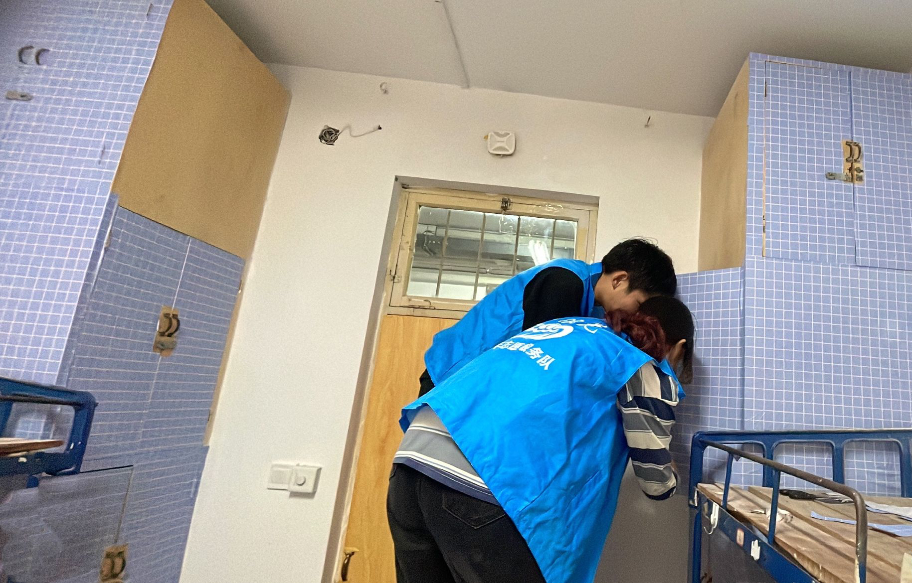 在学院领导的统筹安排下,由学院统一定制、购买壁纸、防撞条以及桌面防水贴等物资,2020、2021级学生志愿者共同参与此次新生宿舍改造工作。为保证改造工作高效有序开展,各年级以班级为单位,点对点进行宿舍改造承包。“小浪花”志愿者们利用课余时间仔细检查门锁、床板、柜子等基础设施情况,为新生宿舍房门、储物柜贴上定制壁纸,在上下床楼梯上贴好防撞条并加以固定,在桌子上贴好印有校风校训的防水贴。同时,志愿者们对新生宿舍进行了彻底清洁和整理,令新生宿舍面貌焕然一新。