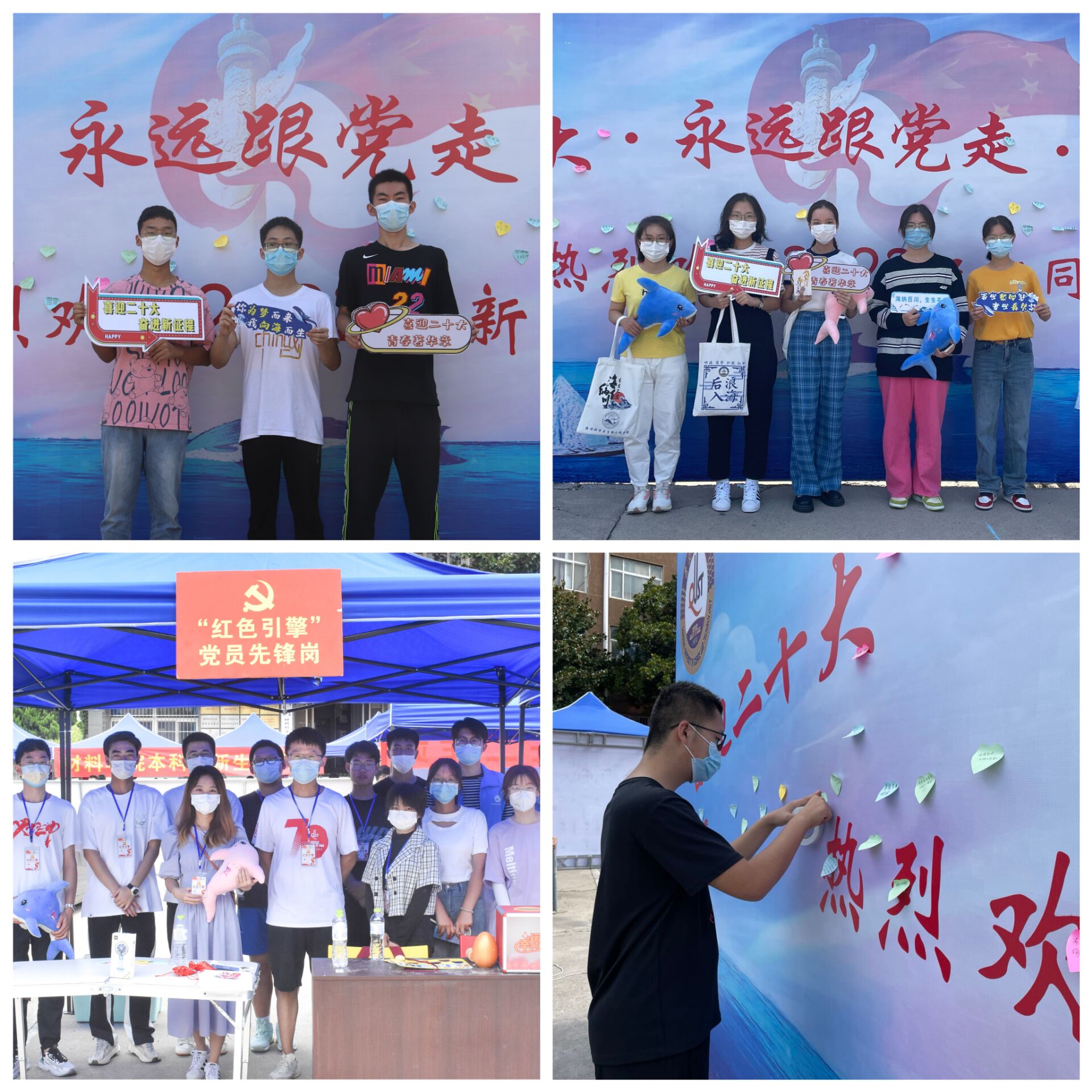 迎新现场设置“青春献礼二十大,砥砺奋进新征程”知识竞赛活动,竞赛题目包含党史知识、校史校情、传统文化、学术规范等,做好新生入校第一课教育。立足学院特色,设计我院专属帆布包、胸牌、福袋以及防疫物资等精美的文创产品,并于报到当日送给各位同学,希望2022级全体新生能够载着深深祝福,与爱同行,砥砺奋进!