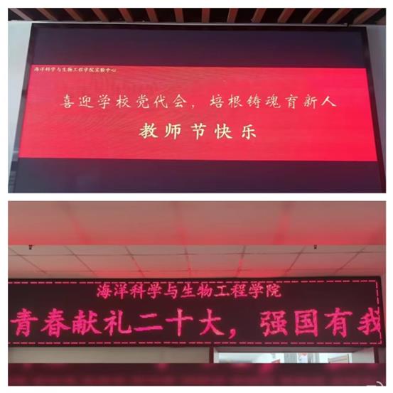 献礼党代会,点灯照初心。学院通过LED字幕滚动、飞字等方式“亮灯”,营造喜迎党代会的浓厚氛围。“喜迎学校党代会,培根铸魂育新人”“青春献礼二十大,强国有我新征程”,一盏盏闪烁的灯光,一句句铿锵的话语,表达了海洋学子对学校第十一次党代会的期盼。