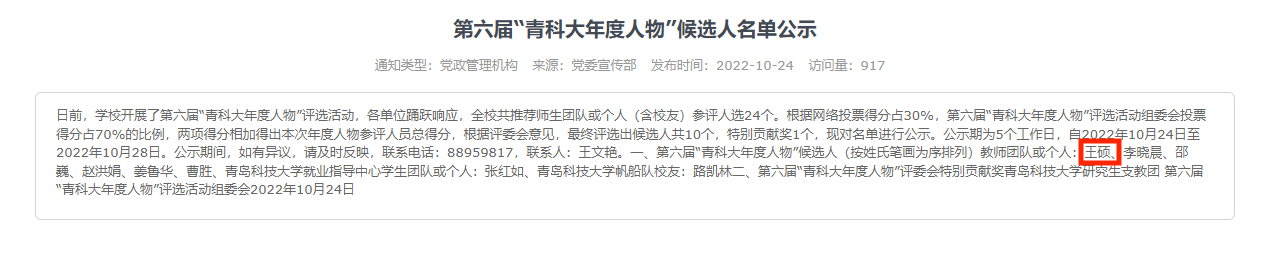 日前,学校开展了第六届“青科大年度人物”评选活动,各单位踊跃响应,全校共推荐师生团队或个人(含校友)参评人选24个,最终评选出候选人共10个,特别贡献奖1个。我院教师王硕获评第六届“青科大年度人物”。