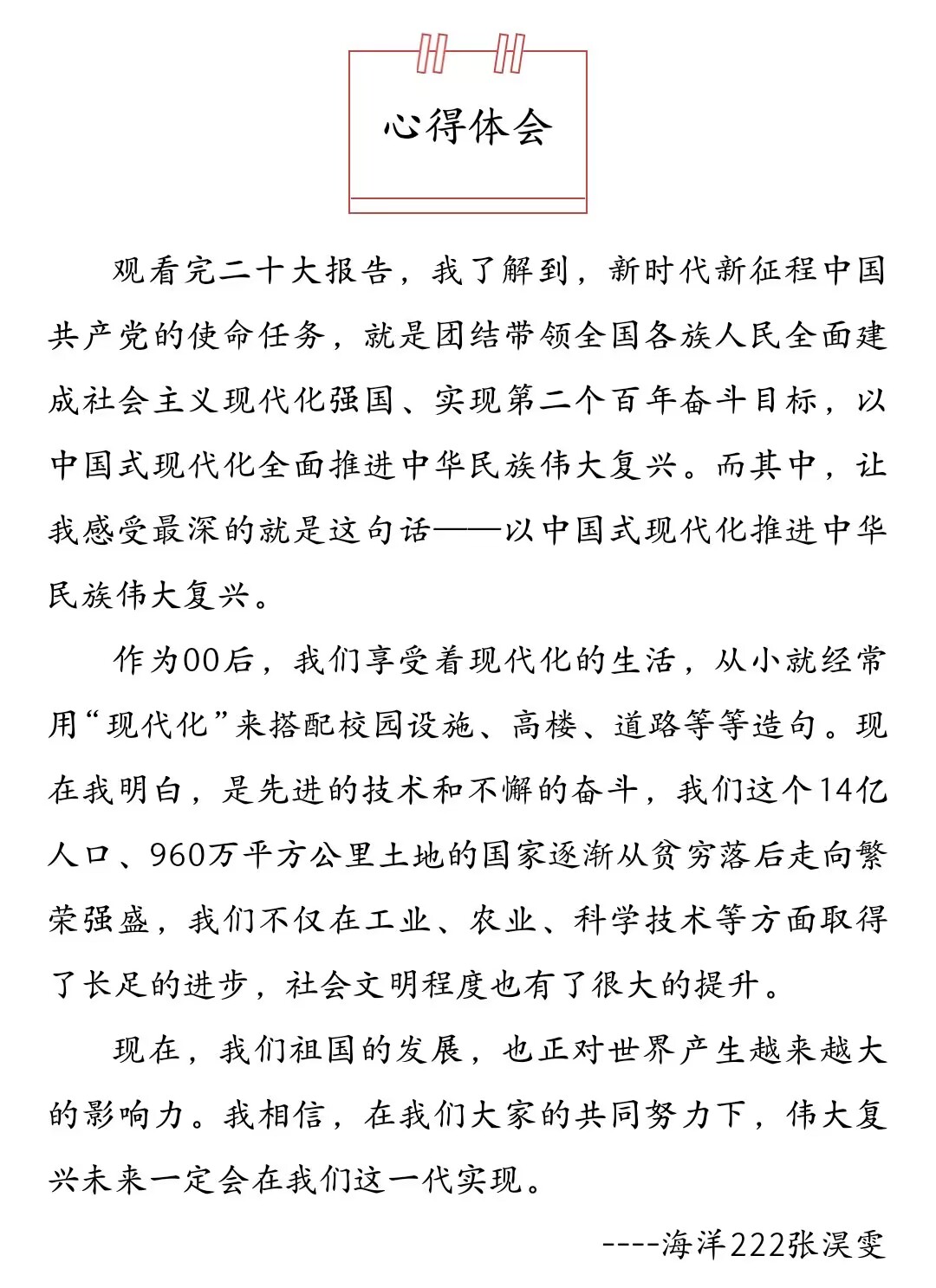 接下来,我院将进一步推进党的二十大精神在海院青年中的学习宣传贯彻,通过组织开展一系列有创意、有思想、有温度的主题教育实践活动,进一步掀起学习宣传贯彻党的二十大精神的热潮。