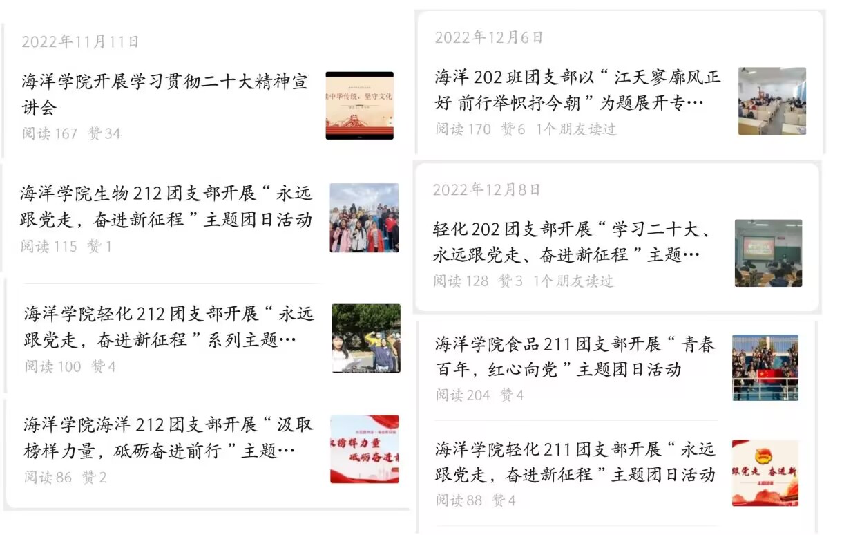 以建团百年为契机组织开展青春歌舞会,开启文化活动新模式;在毕业季和迎新季等重要时间节点组织开展“青春歌会”,让青春和活力在科大沃土之上绽放光芒。同时,组织开展“建团百年”主题微团课比赛、“学习二十大”党史知识竞赛,增强基层团组织活力,号召广大团员积极参与“微团课”和党史知识的学习;录制《团聚青年》等视频。