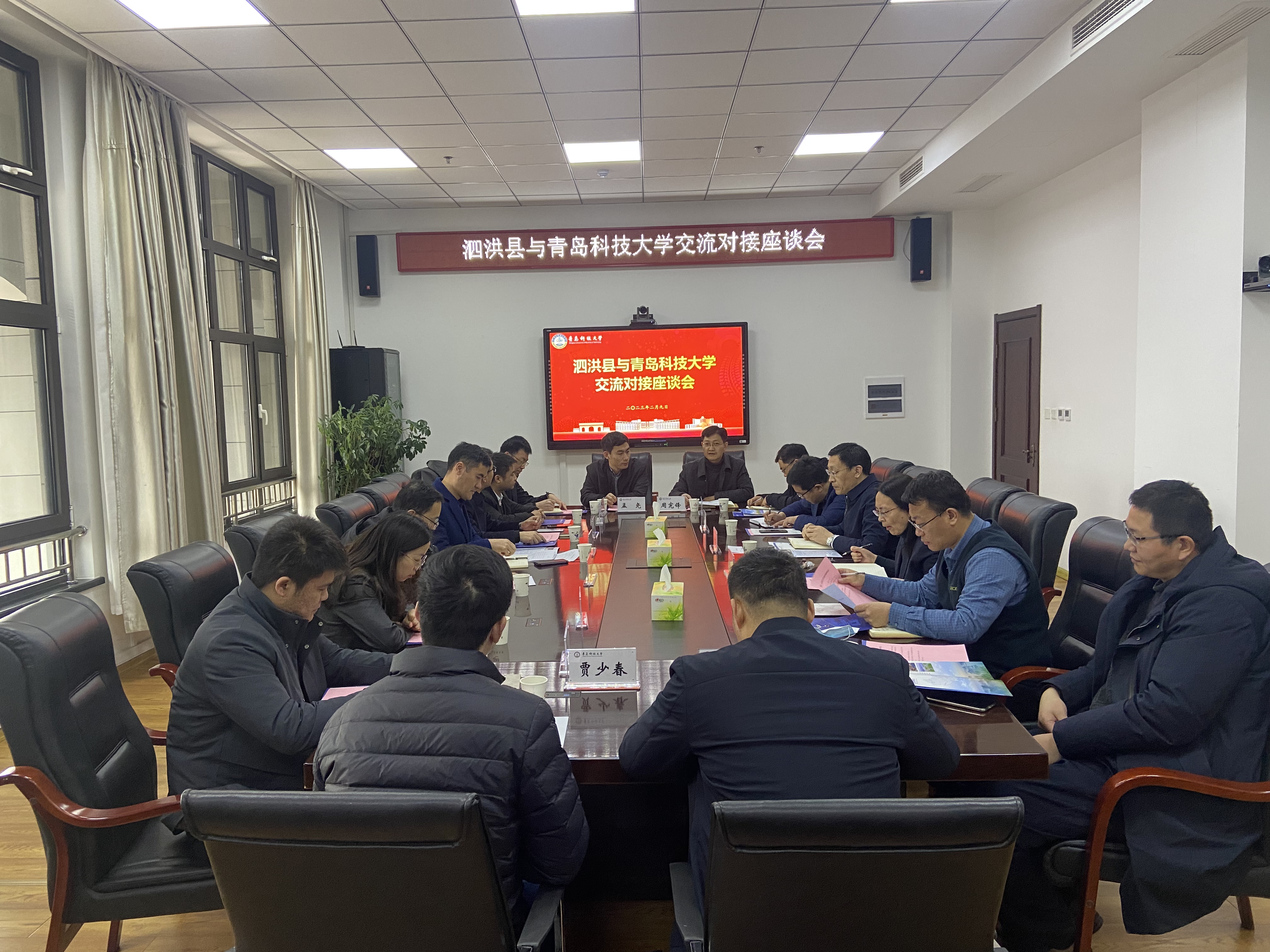 泗洪县有关部门负责同志、第十五批科技镇长团成员与学校相关部门、学院负责人、专家进行了座谈,围绕人才、科技需求等进行了深入对接。党委组织部、人事处、教务处、机电学院、材料学院、我院等单位负责人参加座谈。