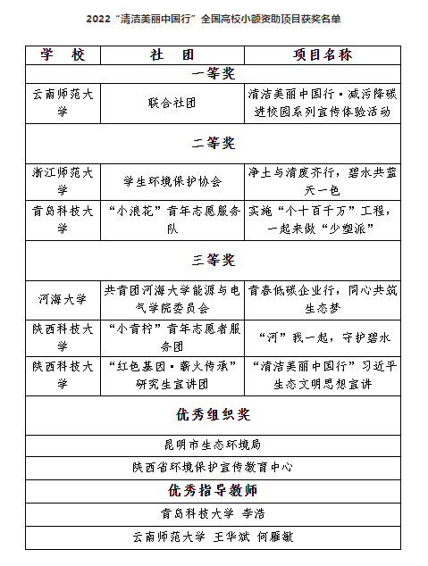 近期,2022“清洁美丽中国行”全国高校小额资助项目获奖名单公布。青岛科技大学我院“小浪花”青年志愿服务队——“实施‘个十百千万’工程,一起来做‘少塑派’”项目获2022“清洁美丽中国行”全国高校小额资助项目二等奖,李浩获“优秀指导教师”。