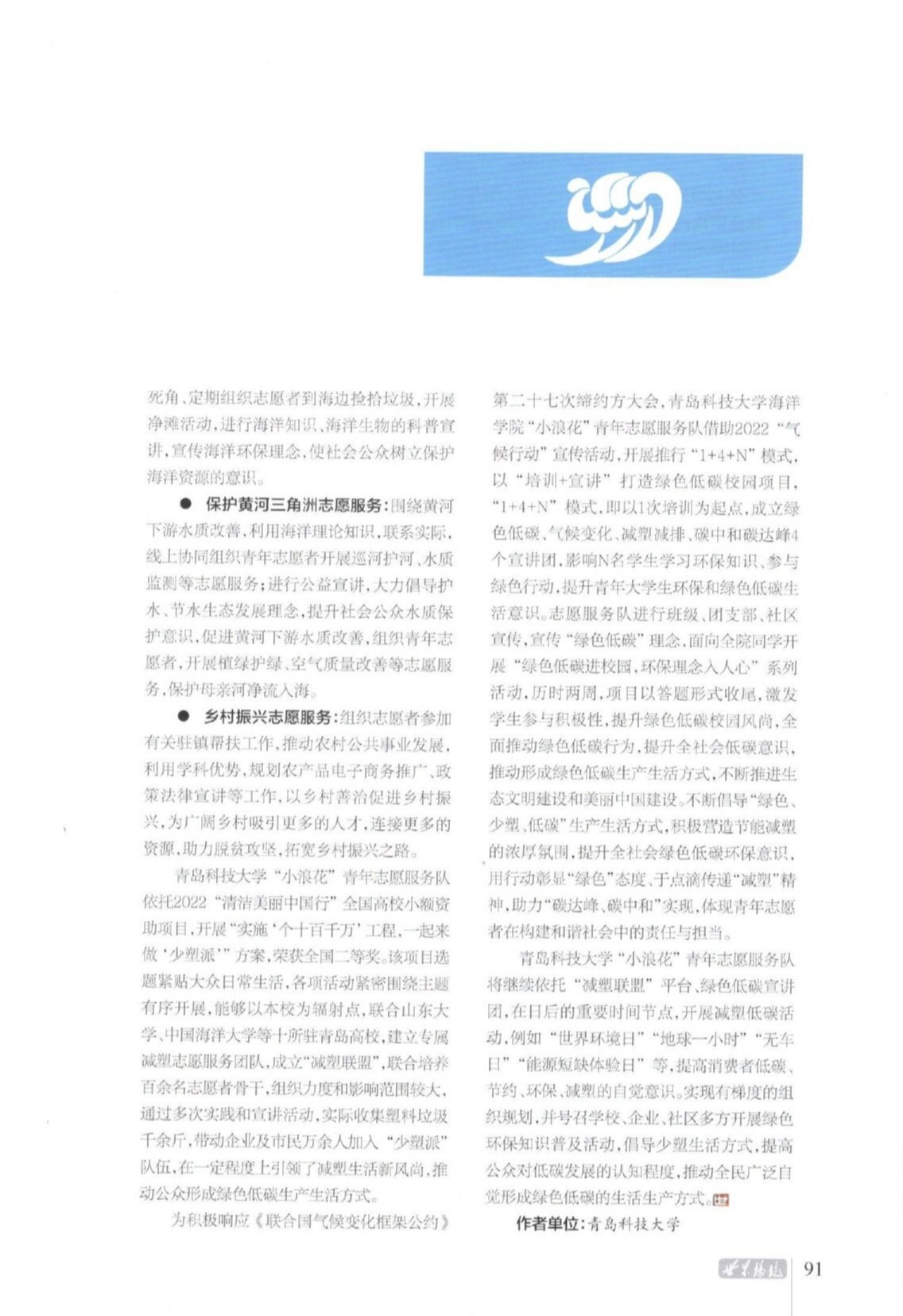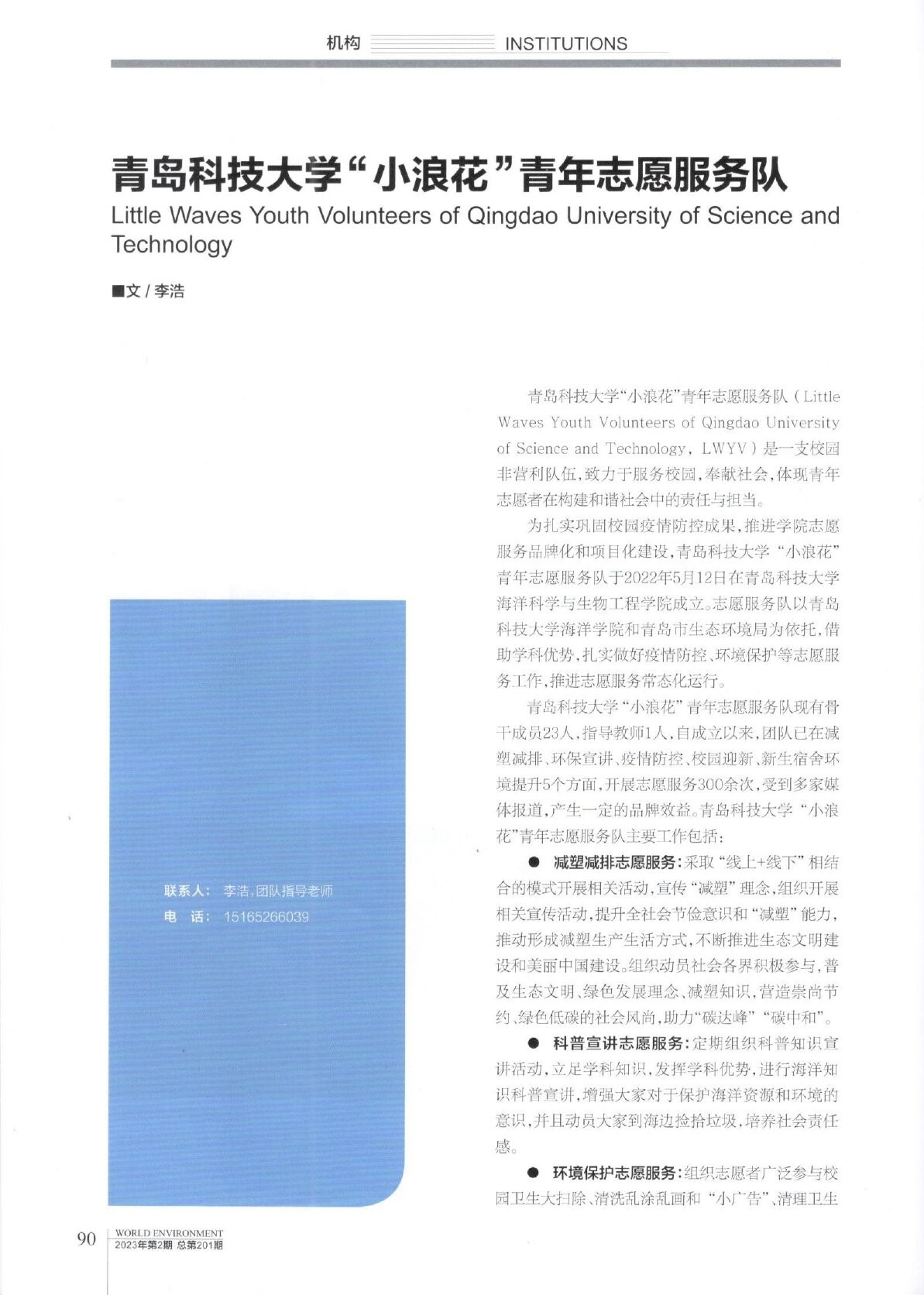 【海洋荣誉】《世界环境》杂志专题报道我院“小浪花”青年志愿服务队