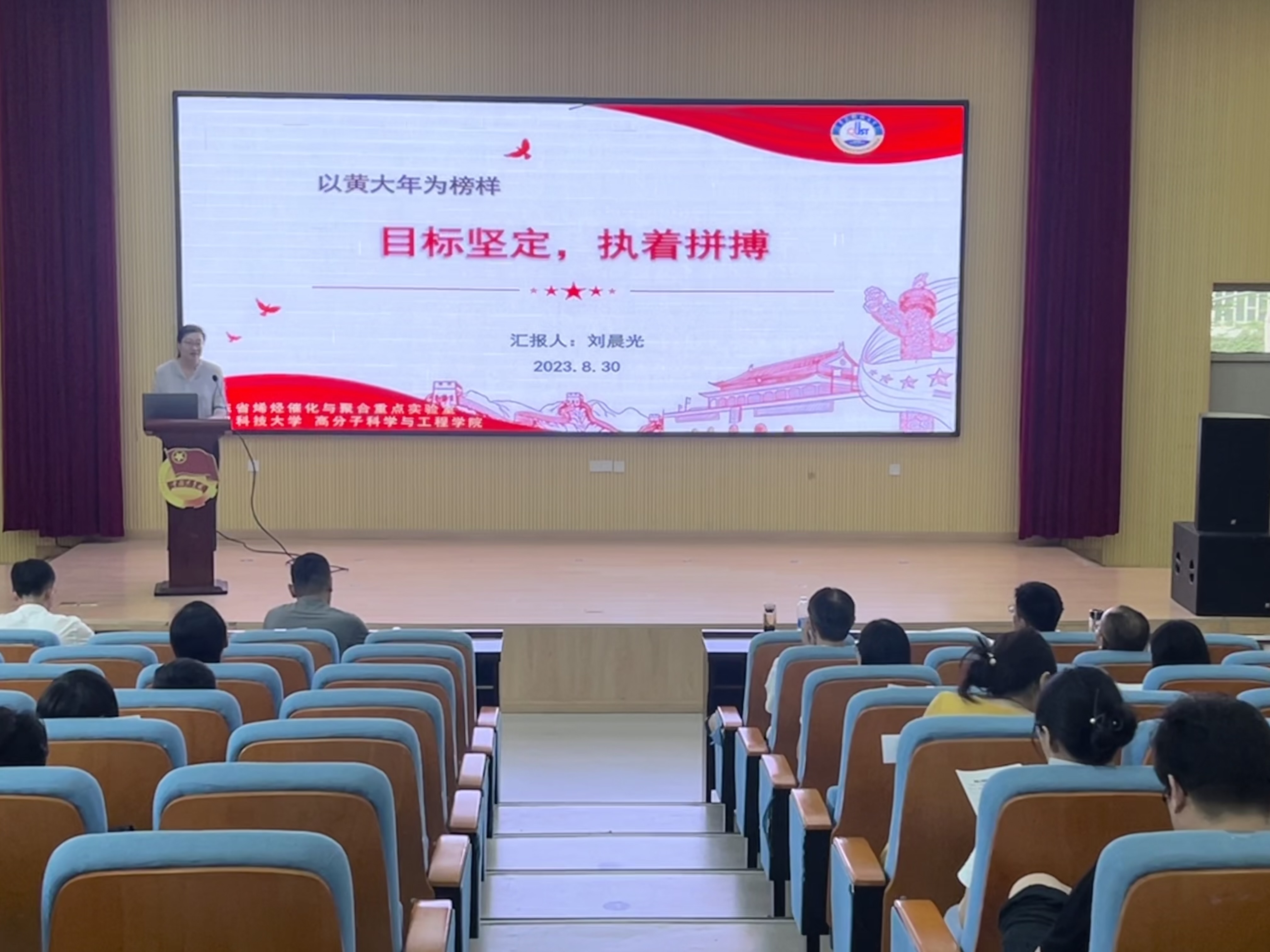 会议邀请第一批山东省高校黄大年式教师团队成员、青岛科技大学师德宣讲团成员刘晨光进行宣讲。刘晨光做了《以黄大年为榜样,目标坚定、执着拼搏》为题的报告,将黄大年同志心有大我、至诚报国的爱国之情和报国之志娓娓道来。