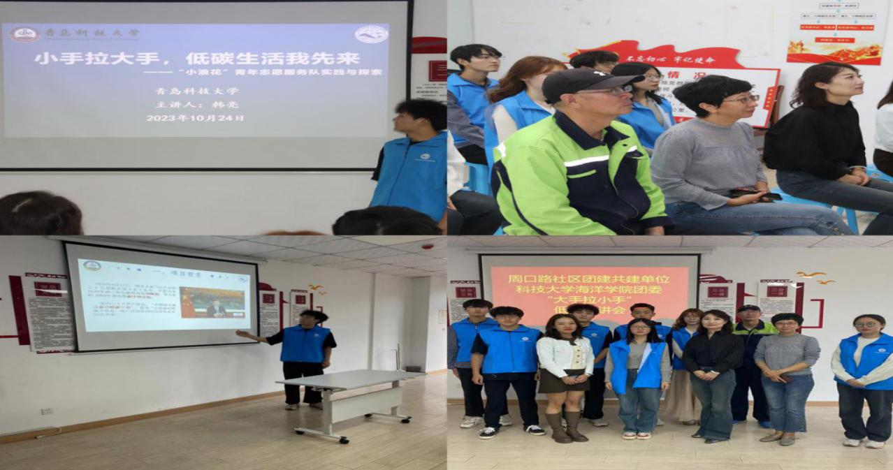 2023年10月24日,我院“小浪花”青年志愿服务队前往青岛市市北区周口路社区展开“低碳”宣讲暨减塑艺术作品展行动。此次活动由2021级辅导员吕珊珊带队。