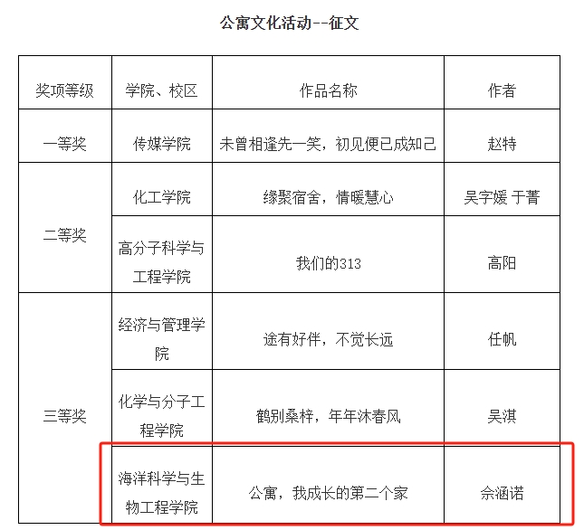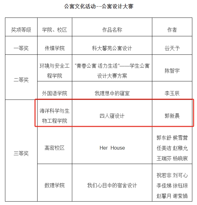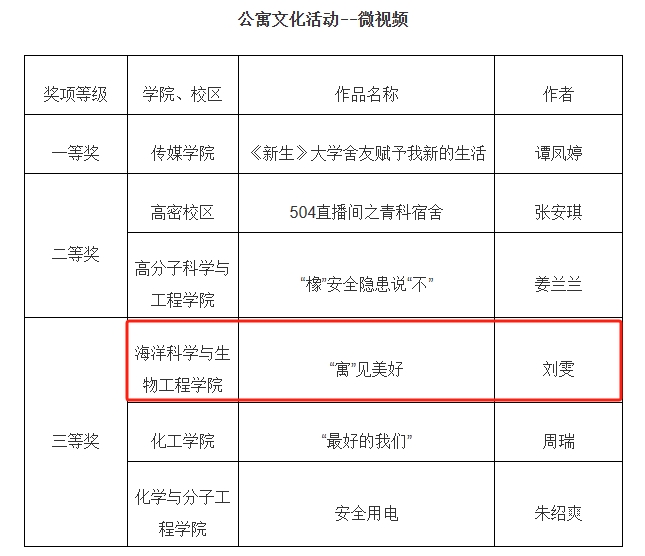 我院举办“公寓的故事”系列活动,遴选出展现新时代学生公寓文化与建设工作风采的优秀作品,报送参选。其中,2023级辅导员郭颖的作品《公寓安全,牢记心间》获公寓育人精品课三等奖、生物233班刘雯的作品《“寓”见美好》获公寓文化活动--微视频三等奖、海洋232班佘涵诺的作品《公寓,我成长的第二个家》获公寓文化活动--征文三等奖、海洋231班郭新晨的作品《四人寝设计》获公寓文化活动--公寓设计大赛三等奖。