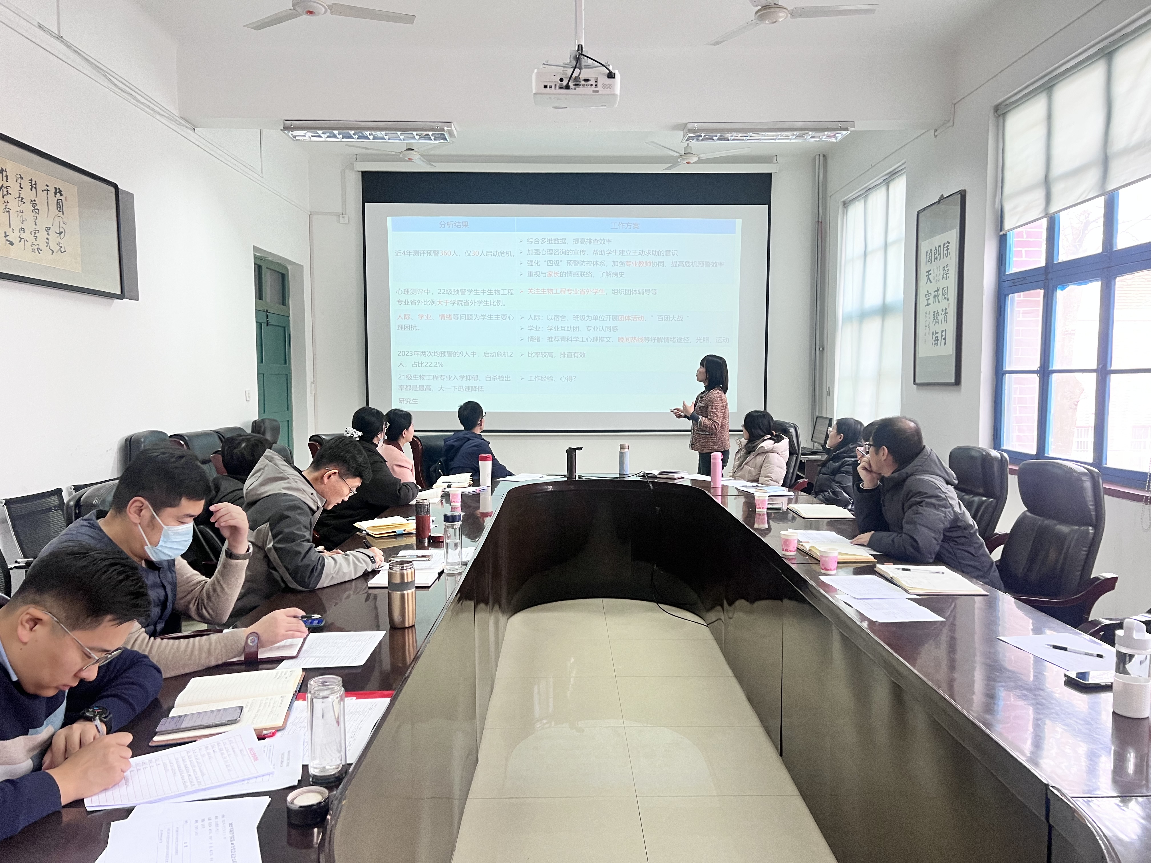 周宪锋代表学院对曹永俊一行来院开展大学生心理健康工作表示欢迎和感谢,要求各支部、教研室高度重视心理健康教育和危机处置,形成工作合力,维护学院安全稳定局面。曹永俊介绍了心理健康服务下基层开展情况,表示将常态化加强与学院沟通互动,科学应对,合理施策,切实维护大学身心健康安全。心理咨询中心教师王珊对比梳理了我院本科生及研究生各年级、各专业学生近年来心理健康测评数据动态变化,并介绍我院学生心理危机和个体咨询情况。心理咨询中心主任李海玲结合我院心理健康测评分析结果,聚焦重点问题,提供“订制式”心理健康教育措施和方案。与会人员结合各自工作经验,就进一步加强心理健康宣传、教育、服务工作进行了交流讨论。