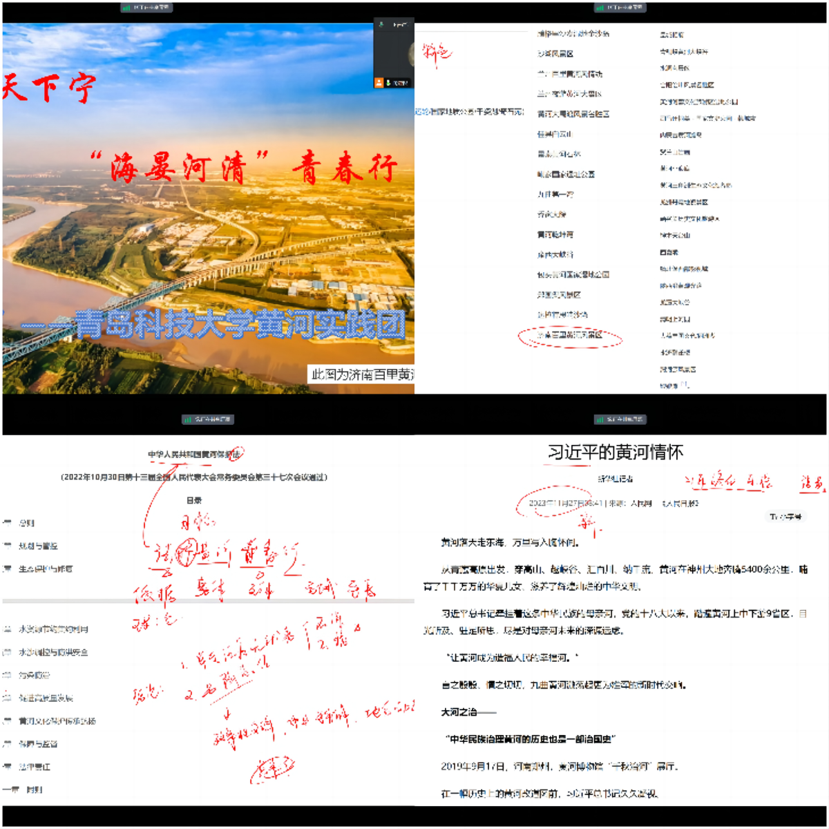 经水利部黄河水利委员会专业老师培训后,“海晏河清”实践团深入学习《中华人民共和国黄河保护法》、习近平生态文明思想和习近平总书记关于黄河保护治理的重要讲话指示批示精神。组织线上交流学习会,为进一步的实践工作,搭建坚实的理论基础与道德意识。