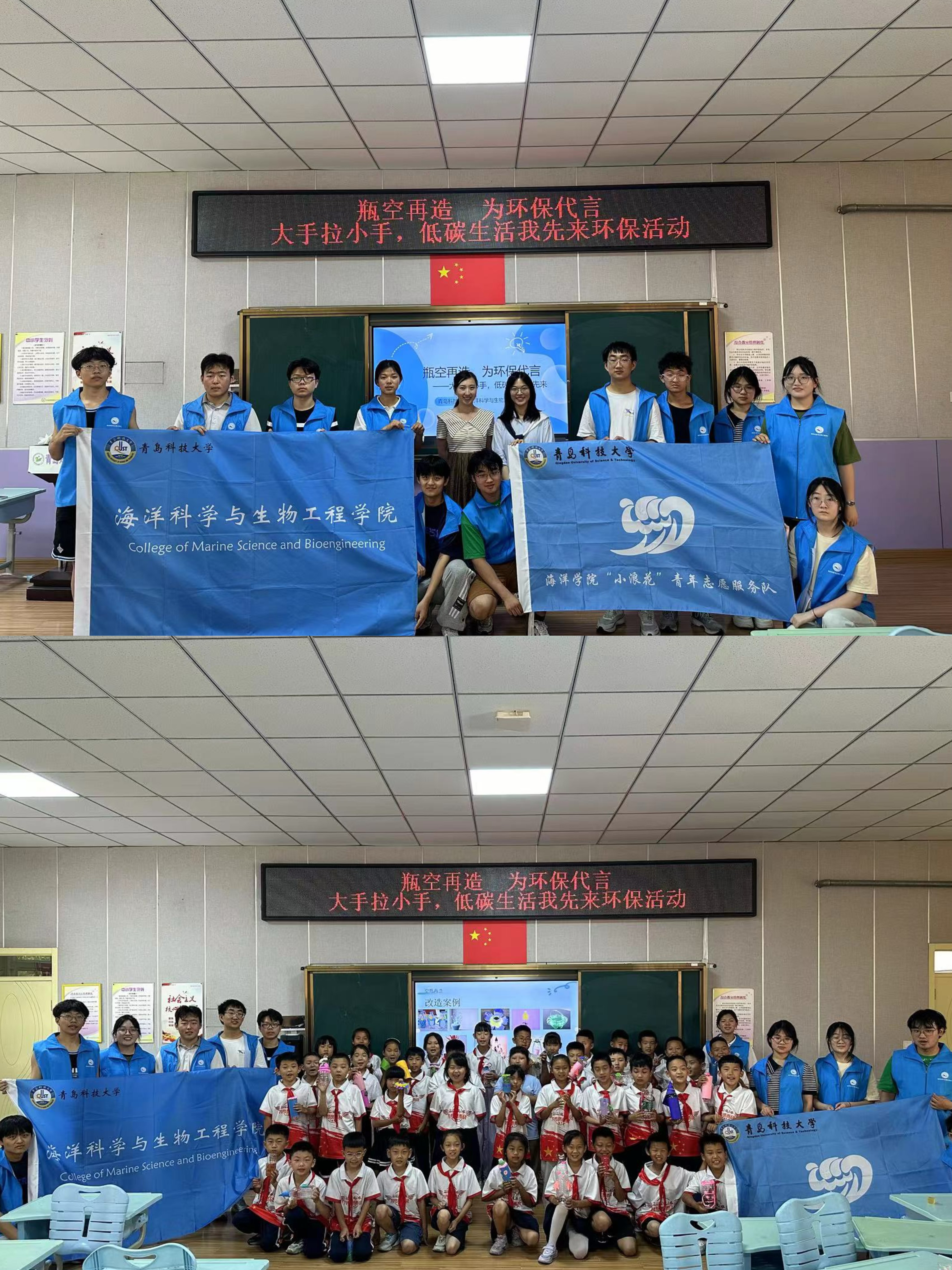 为引导广大青年学生积极发挥生态环保生力军作用,同时深化实践育人成果,倡导减塑生活新风尚,6月18日下午,“小浪花”青年志愿服务队赴郑州路第二小学开展“‘瓶’空再造,为环保代言——大手拉小手,低碳生活我先来”活动,旨在推进环保减塑,倡导绿色生活。