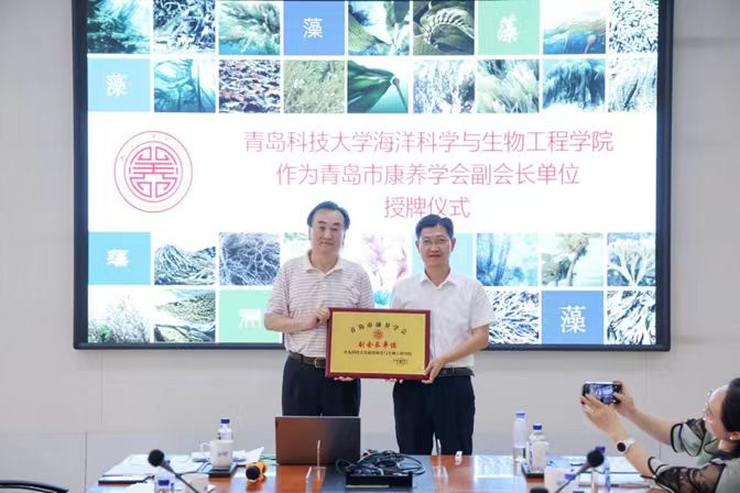 研讨会上,青岛市康养学会授予青岛科技大学必赢线路检测中心副会长单位牌匾。