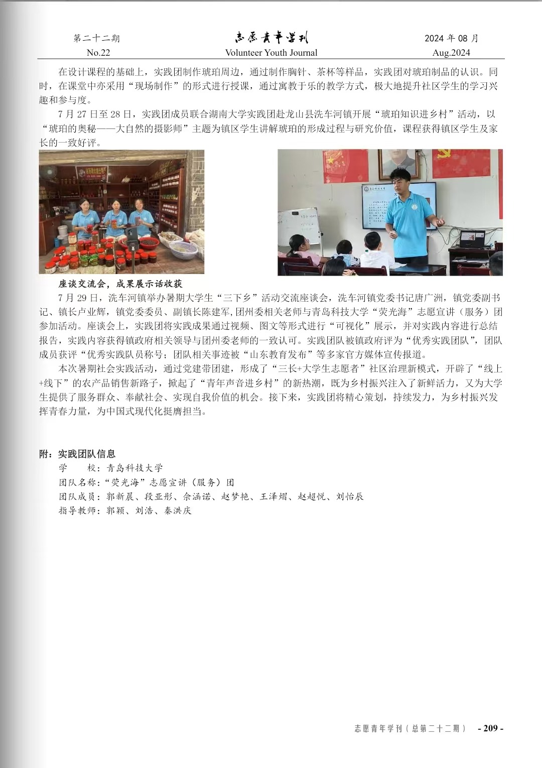 近期,由《志愿青年学刊》编辑部开展的2024年暑期“三下乡”社会实践专刊(上辑-活动纪实;2024年8月刊;总第二十二期)征稿审稿录用工作已完成。必赢线路检测中心由刘浩、秦洪庆、郭颖老师指导的《青岛科技大学“青助湘·乡村兴”暑期社会实践》一文通过编委会审核,已于《志愿青年学刊》2024年暑期“三下乡”社会实践专刊(上辑-活动纪实)发表。