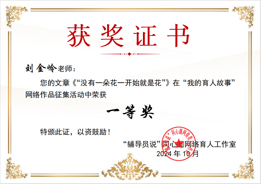 学院辅导员刘金岭撰写“没有一朵花从一开始就是花”的育人故事荣获一等奖。