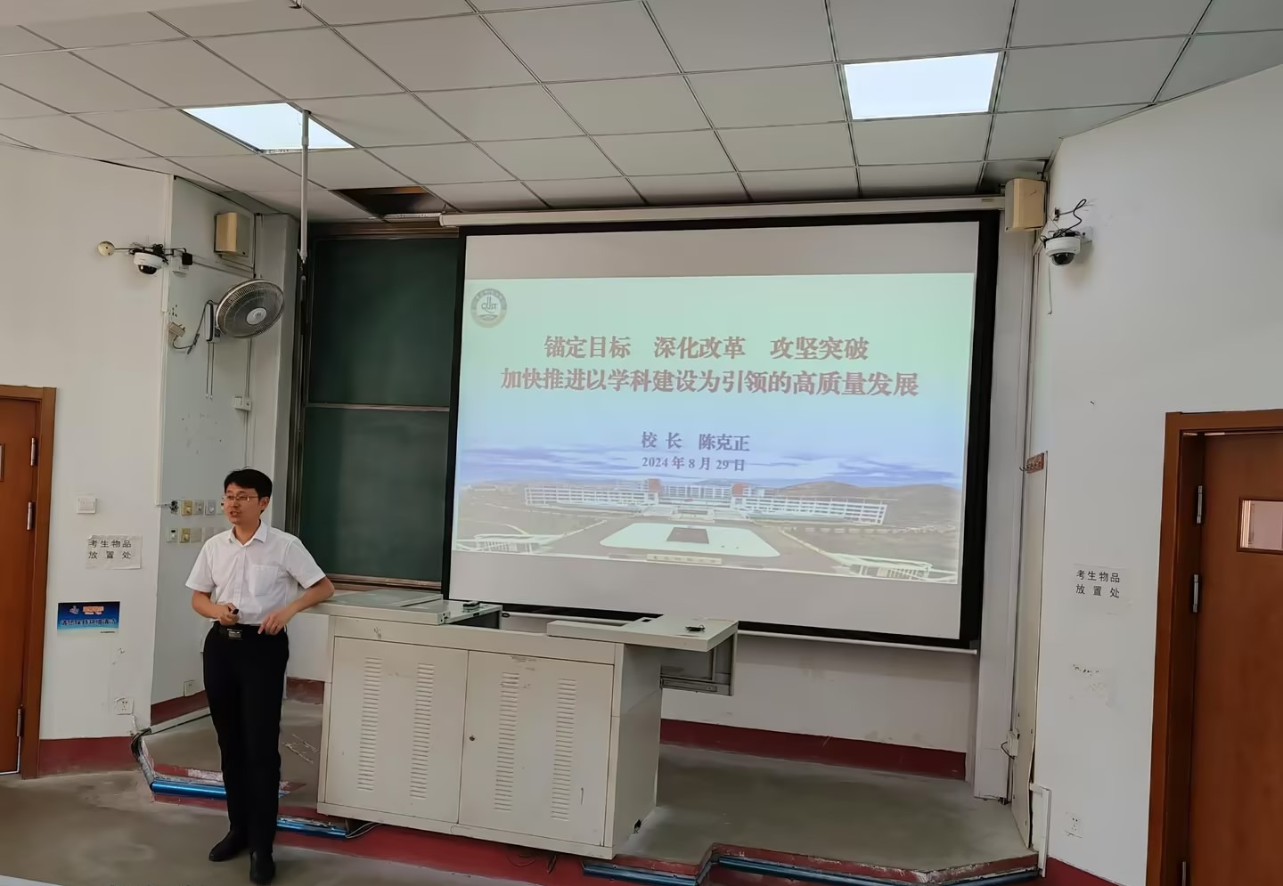 顾玉超结合学校学科建设高质量发展目标,以《奋进新征程勇担新使命》为题,介绍了党的二十届三中全会精神,带领同学们学习了《中共中央关于进一步全面深化改革、推进中国式现代化的决定》,他指出,党的二十届三中全会为新征程上的进一步全面深化改革指明了方向、提供了根本遵循,希望全院学生能够以此学习为契机,坚定不移听党话、跟党走,争做有理想、敢担当、能吃苦、肯奋斗的新时代好青年,在推进强国建设、民族复兴伟业中展现青春作为、彰显青春风采、贡献青春力量,奋力书写为中国式现代化挺膺担当的青春篇章。