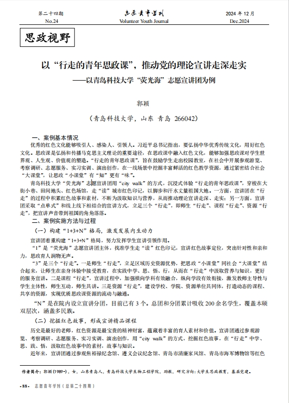 近日,《志愿青年学刊》第二十四期刊登必赢线路检测中心“荧光海”志愿宣讲团特色做法。